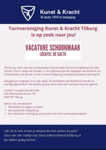 We zoeken een schoonmaker voor 4 uur per week voor de Saltozaal. Bij intresse mail naar bestuur@kunstenkrachttilburg.nl